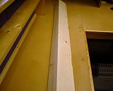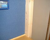 The first picture shows the corner, including detail of the fascia that holds the suspended ceiling. As you can see, it's a bit tricky. Basically, the plan is to stretch the fabric of the above piece of Soundsorba around the edge of the 2-by-4. Then, the gap between the 2-by-4 and Spur shelf bracket (brick wall) is closed with a narrow strip of Soundsorba (which is a tight fit to hold the fabric in place). Finally, the gap between the 2-by-4 frame and the large piece of Soundsorba just fitted is filled with a 12 inch strip of Soundsorba. I spent a bit of time working on the join between these two so that I wouldn't need to use a T-section piece. Finally, to improve the corner detail, I gently heated the fabric that covers the 2-by-4 - this causes the glue to melt and stick the fabric to the timber...